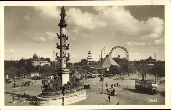 Ak Wien 2 Leopoldstadt, Praterstern, Bus, Riesenrad, Tegetthoffdenkmal