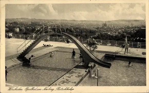Ak Wiesbaden in Hessen, Neroberg, Opelbad, Rutschbahn, Panorama