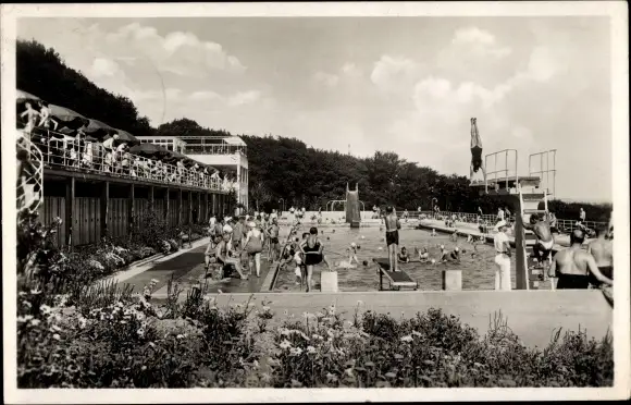 Ak Wiesbaden in Hessen, Opelbad, Badegäste, Sprungbrett, Sprungturm