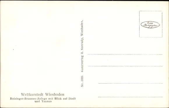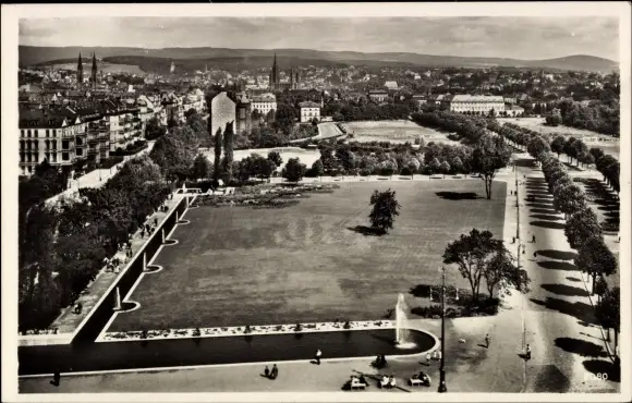 Ak Wiesbaden in Hessen, Reisinger Brunnenanlage mit Blick auf Stadt und Taunus