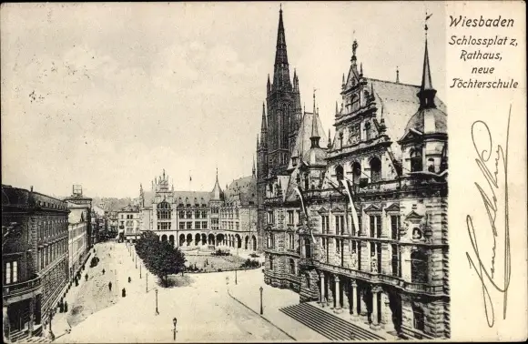 Ak Wiesbaden in Hessen, Schlossplatz, Rathaus, neue Töchterschule