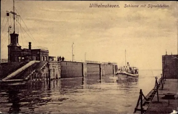 Ak Wilhelmshaven an der Nordsee, Schleuse mit Signalstation, Schiff