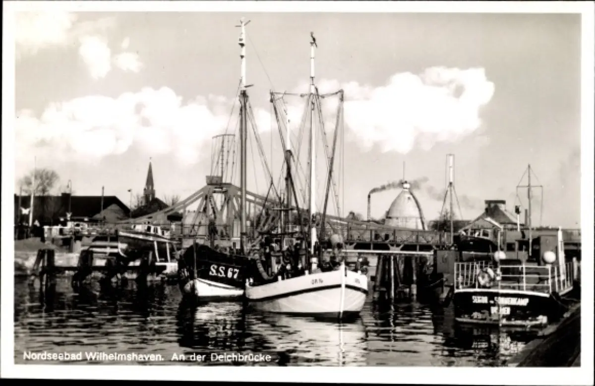 Ak Wilhelmshaven in Niedersachsen, Deichbrücke, Fischerboote