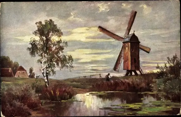 Ak Windmühle, Bauer, Fluss, Birke, Wohnhaus