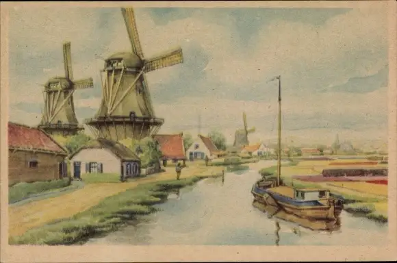 Ak Windmühlen, Landschaftsmotiv, Kanal
