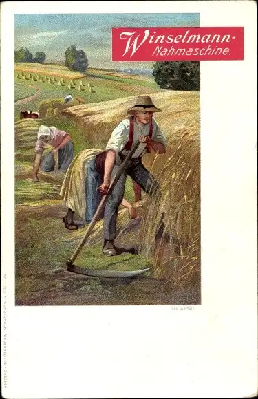 Ak Winselmann Nähmaschine, Feldarbeiter, Sense