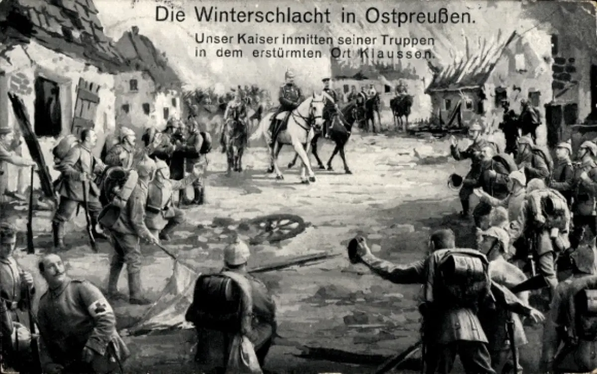 Ak Winterschlacht in Ostpreußen, Kaiser Wilhelm II. mit Truppen in Klaussen, 1. WK