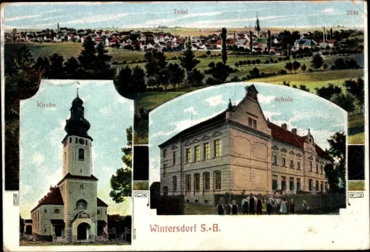 Ak Wintersdorf Meuselwitz in Thüringen, Gesamtansicht, Kirche, Schule
