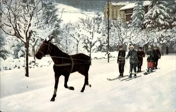 Ak Wintersport, Pferd zieht Skifahrer, Skijöring
