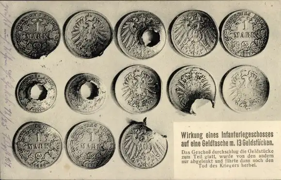 Ak Wirkung eines Infanteriegeschosses auf eine Geldtasche mit 13 Geldstücken, Münzen