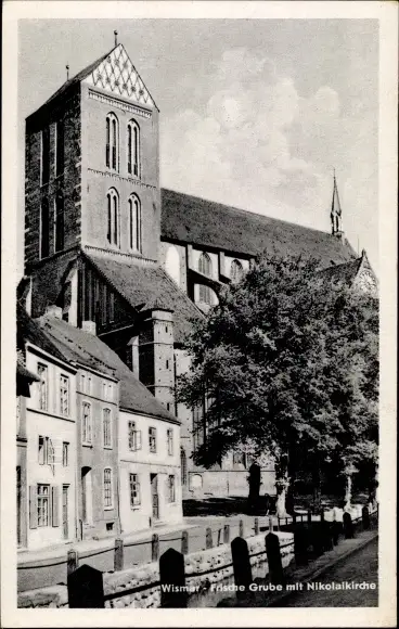 Ak Wismar, Partie an der Frischen Grube, Nikolaikirche