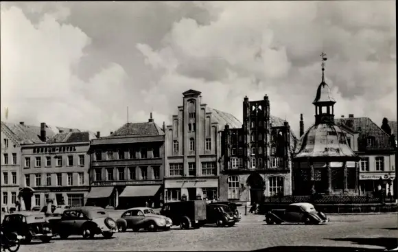 Ak Wismar in Mecklenburg, Markt mit Wasserkunst, Alter Schwede, Autos