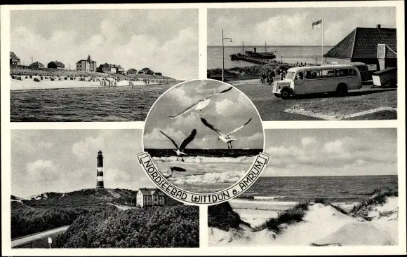 Ak Wittdün auf Amrum Nordfriesland, Leuchtturm, Strand, Dünen, Autobus