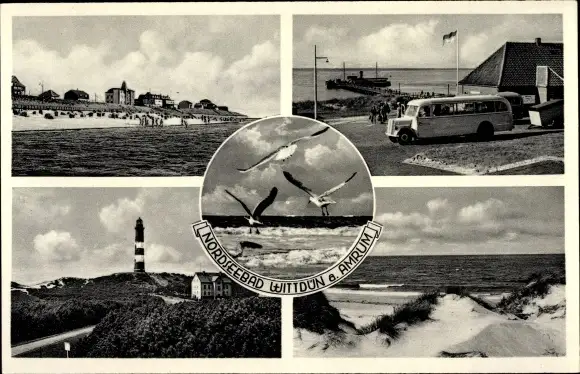 Ak Wittdün auf Amrum Nordfriesland, Leuchtturm, Strand, Dünen, Autobus
