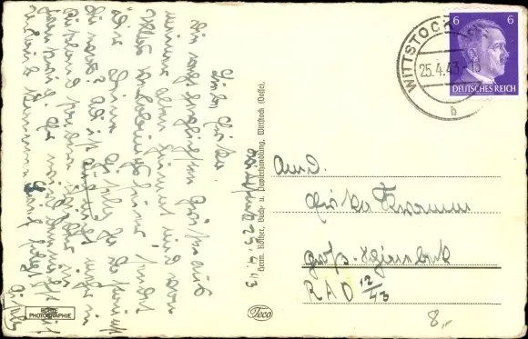 Zustand, siehe Scan, gelaufen, 1943 - ca 14 cm X 9 cm