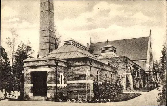 Ak Woking South East England, The Crematorium, Backsteinbau, umgeben von Bäumen