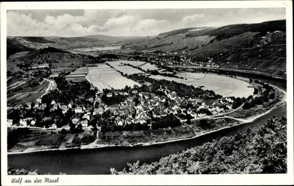 Ak Wolf Traben Trarbach an der Mosel, Ortspanorama mit Moselbiegung