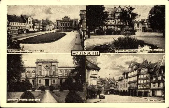 Ak Wolfenbüttel, Saarplatz, Rathaus, Krambuden, Trinitatiskirche, Herzog August Denkmal, Bibliothek