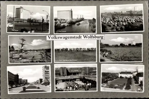 Ak Wolfsburg in Niedersachsen, Schwimmbad, Rathaus, Straßenpartie