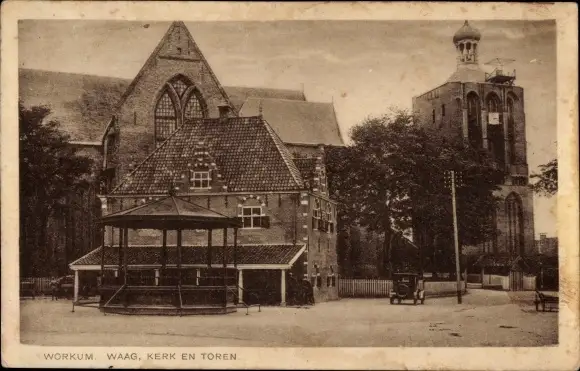 Ak Workum Friesland Niederlande, Waag, Kirche und Turm