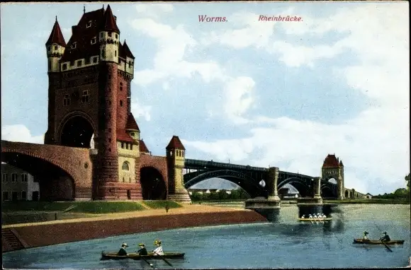 Ak Worms am Rhein, Rheinbrücke, Ruderboote