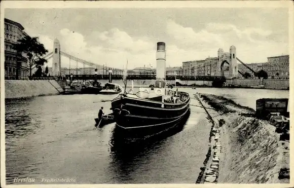 Ak Wrocław Breslau Schlesien, Freiheitsbrücke, Dampfer, Anlegestelle