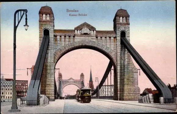 Ak Wrocław Breslau Schlesien, Kaiser Brücke mit Straßenbahn