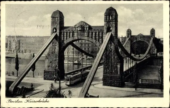 Ak Wrocław Breslau Schlesien, Kaiserbrücke, Straßenbahn
