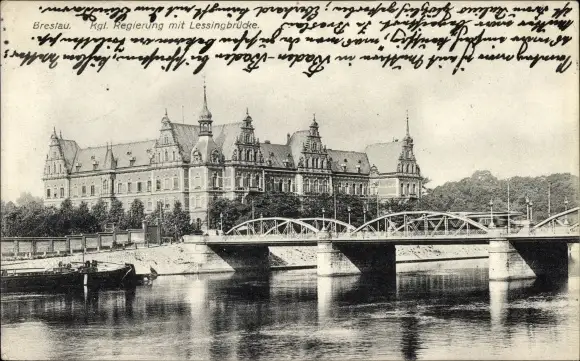 Ak Wrocław Breslau Schlesien, Königliche Regierung mit Lessingbrücke