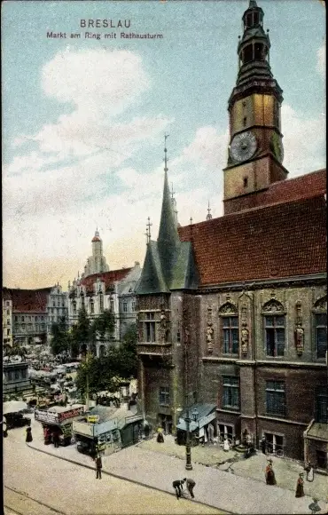 Ak Wrocław Breslau Schlesien, Markt am Ring mit Rathausturm