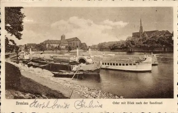 Ak Wrocław Breslau Schlesien, Oder, Sandinsel, Boote