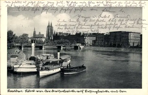 Ak Wrocław Breslau Schlesien, Oderpartie, Lessingbrücke, Dom, Blick v. d. Kaiserbrücke, Salondampfer