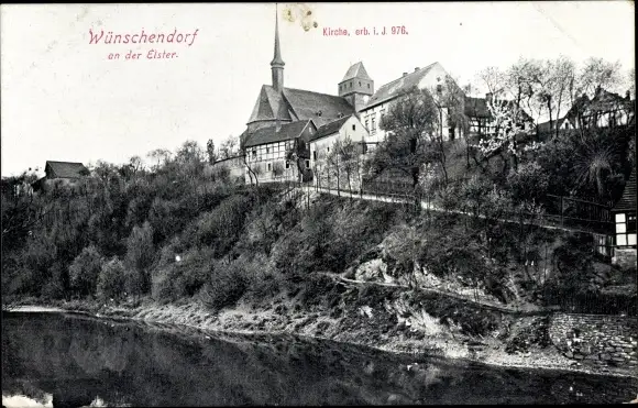Ak Wünschendorf an der Elster, Kirche Veitsberg, Uferpartie