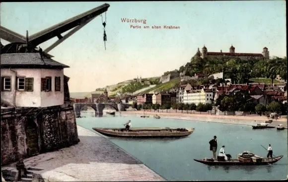 Ak Würzburg am Main Unterfranken, Partie am alten Kran, Boote, Festung Marienberg