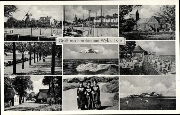 Ak Wyk auf Föhr Nordfriesland, Windmühle, Tachten, Panorama, Strand, Promenade