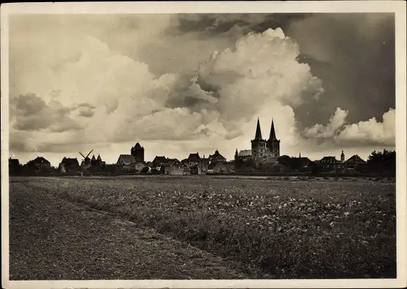 Ak Xanten am Niederrhein, Stadtsilhouette, Dom, Windmühle