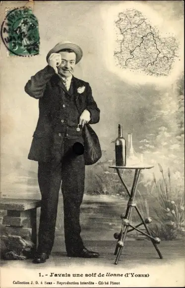 Ak Yonne, J'avais une soif de lionne, Mann mit Weinflasche, Landkarte