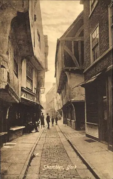 Ak York Yorkshire England, Shambles, Architektur, gepflasterte Straße, Menschen