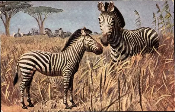 Ak Zebras in der Savanne, Mutter mit Jungtier, Strauß