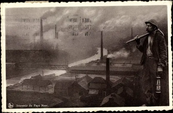 Ak Zeche, Bergmann, Spitzhacke, Handlaterne, Schornsteine