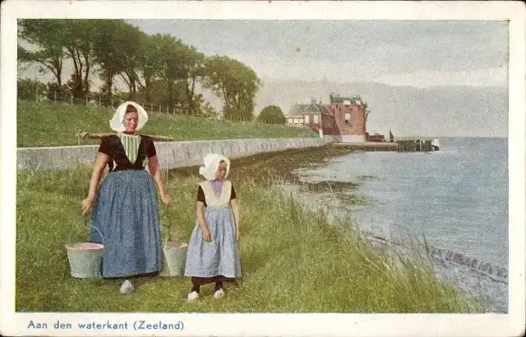 Ak Zeeland Niederlande, Mutter und Kind in Tracht am Ufer