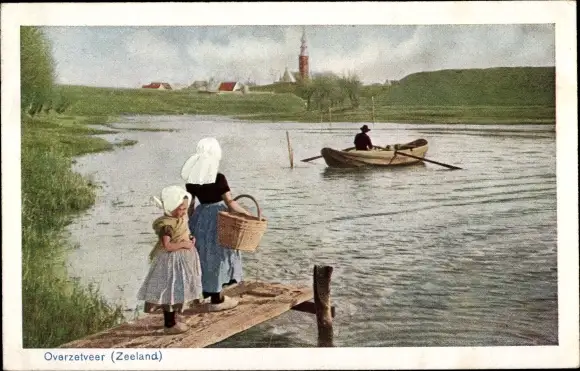 Ak Zeeland, Overzetveer, Mutter mit Kind auf dem Steg