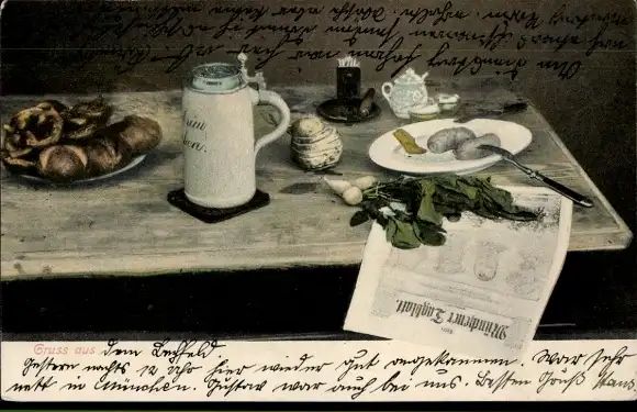 Ak Zeitung, Essen, Würstchen, Besteck, Bierglas