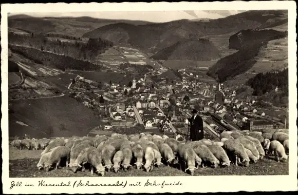 Ak Zell im Wiesental, Panorama mit Schafweide, Hirte