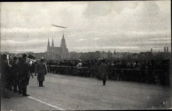 Ak Zeppelins große Fernfahrt nach München 1909, Luftschiff über der Stadt