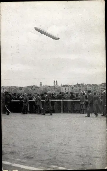 Ak Zeppelins große Fernfahrt nach München 1909, Luftschiff über der Stadt, Schaulustige