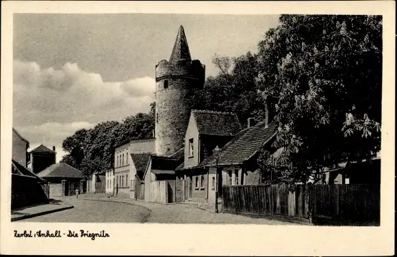 Ak Zerbst in Anhalt, Straßenpartie im Ort, Turm
