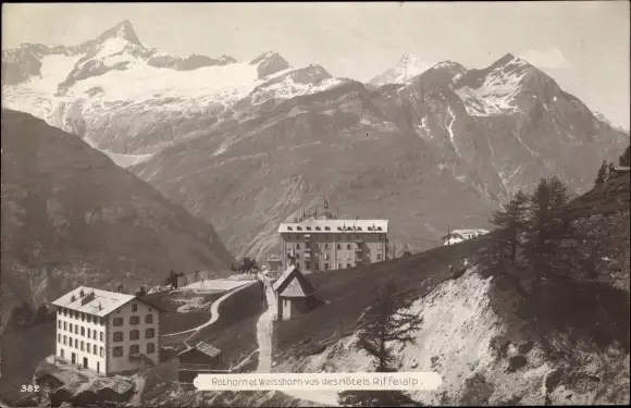 Ak Zermatt Kanton Wallis, Rothorn et Weisshorn vus des Hotels Riffelalp
