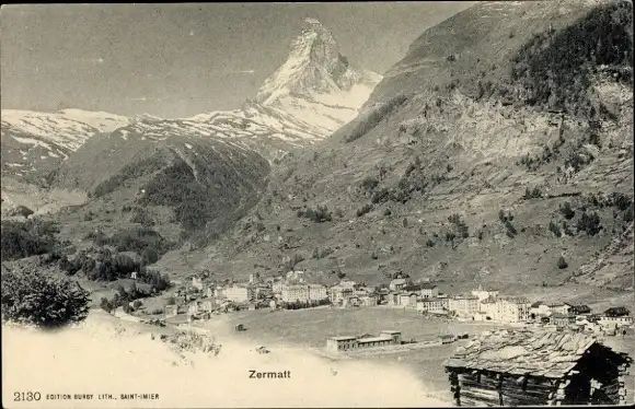 Ak Zermatt Kanton Wallis Schweiz, Ansicht des Matterhorns, Zermatt im Tal, Berglandschaft