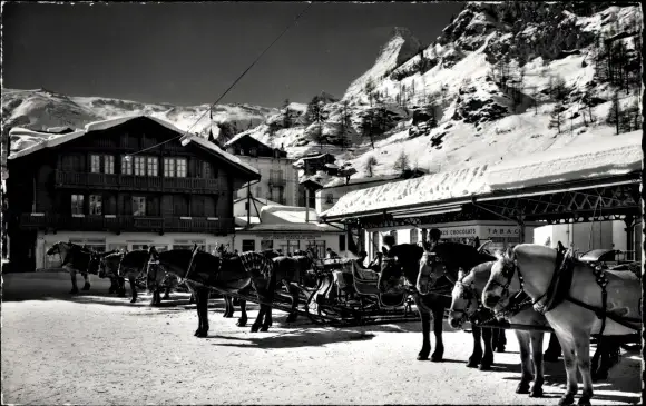 Ak Zermatt Kanton Wallis Schweiz, Bahnhofplatz und Matterhorn